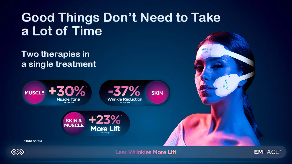 EMFACE™ is ideal for lifting the brow, reducing forehead lines, sculpting and improving jawline contours, and tightening neck laxity—all without incisions, injections, or sutures. Clinical studies have shown an average 30 percent improvement in muscle tone, 23 percent improvement in lift, and 37 percent fewer wrinkles after treatment.