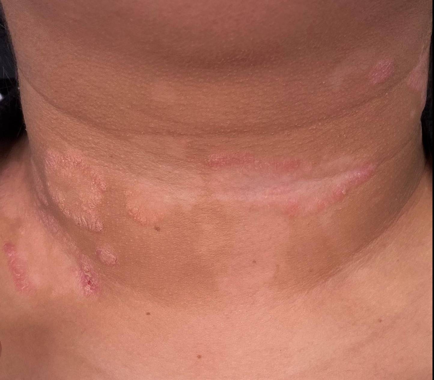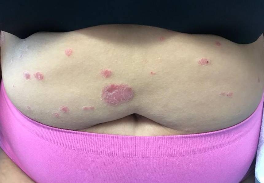 This a 44 year old female patient who has aproximately 30% of her body surface area affected by psoriatic plaques. She has tried and failed multiple topical therapies including Photothrepy, Cyclosporine, and Enbrel. Dr.Turner suggested Taltz, an IL-17 inhibitor. After the patient agreed, she witnessed 100% clearance of her psoriasis. She still continues Taltz therapy till this day and remains satisfied with her results.