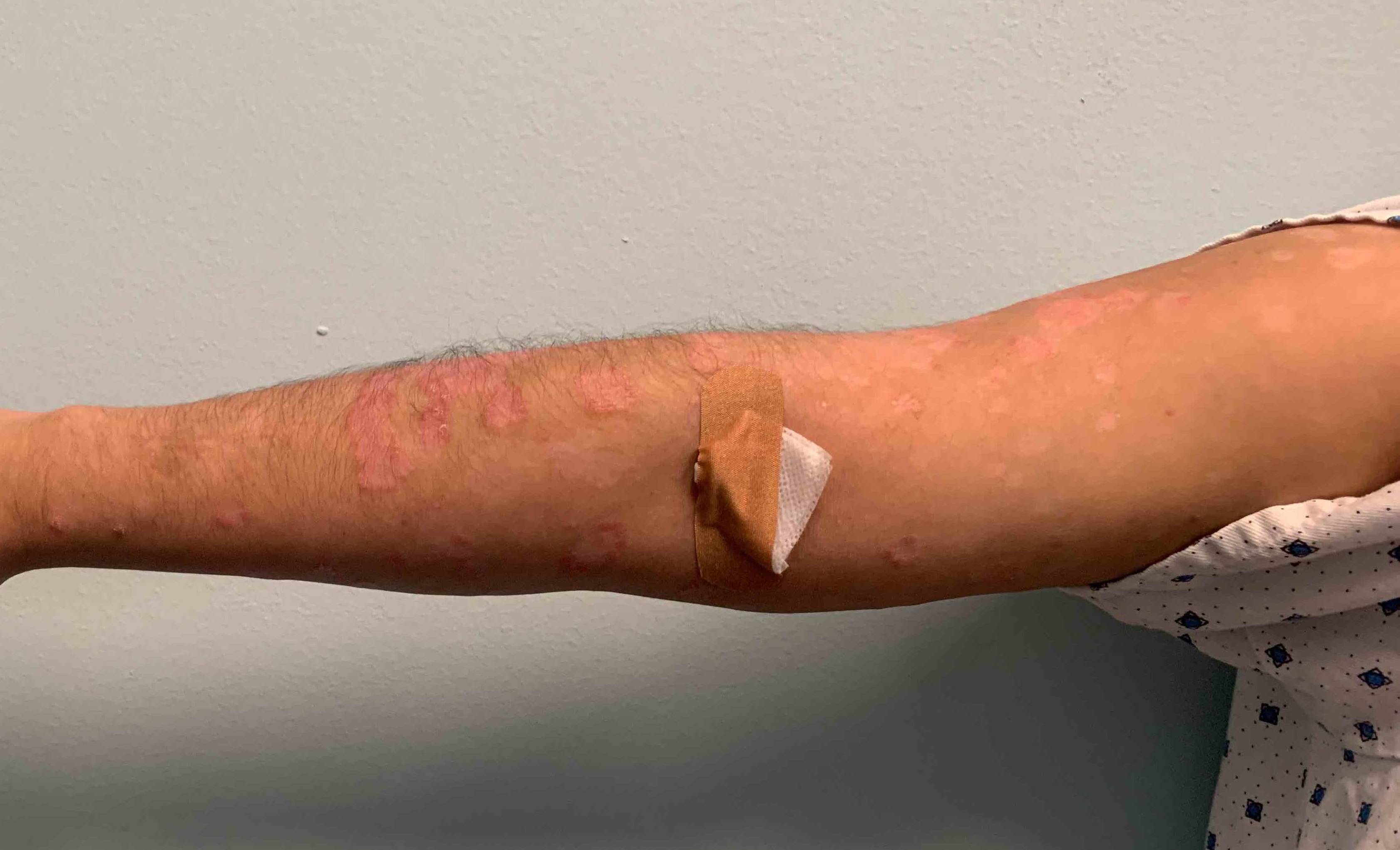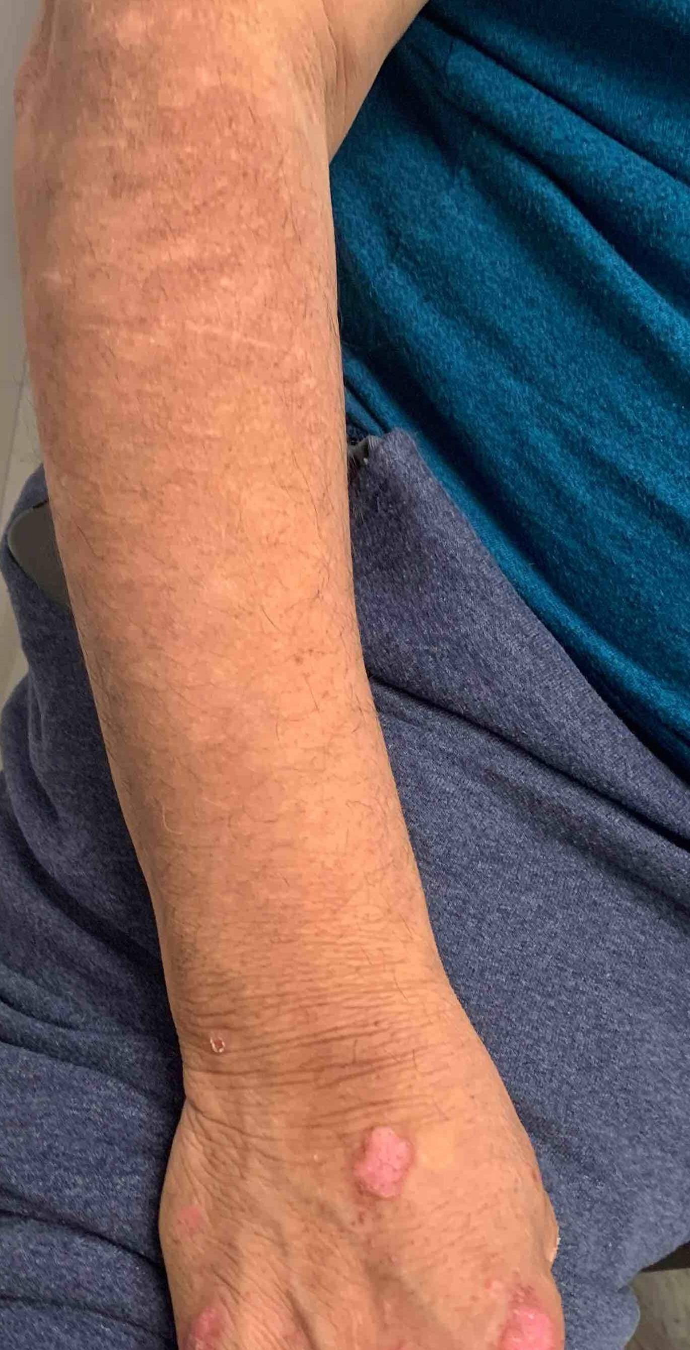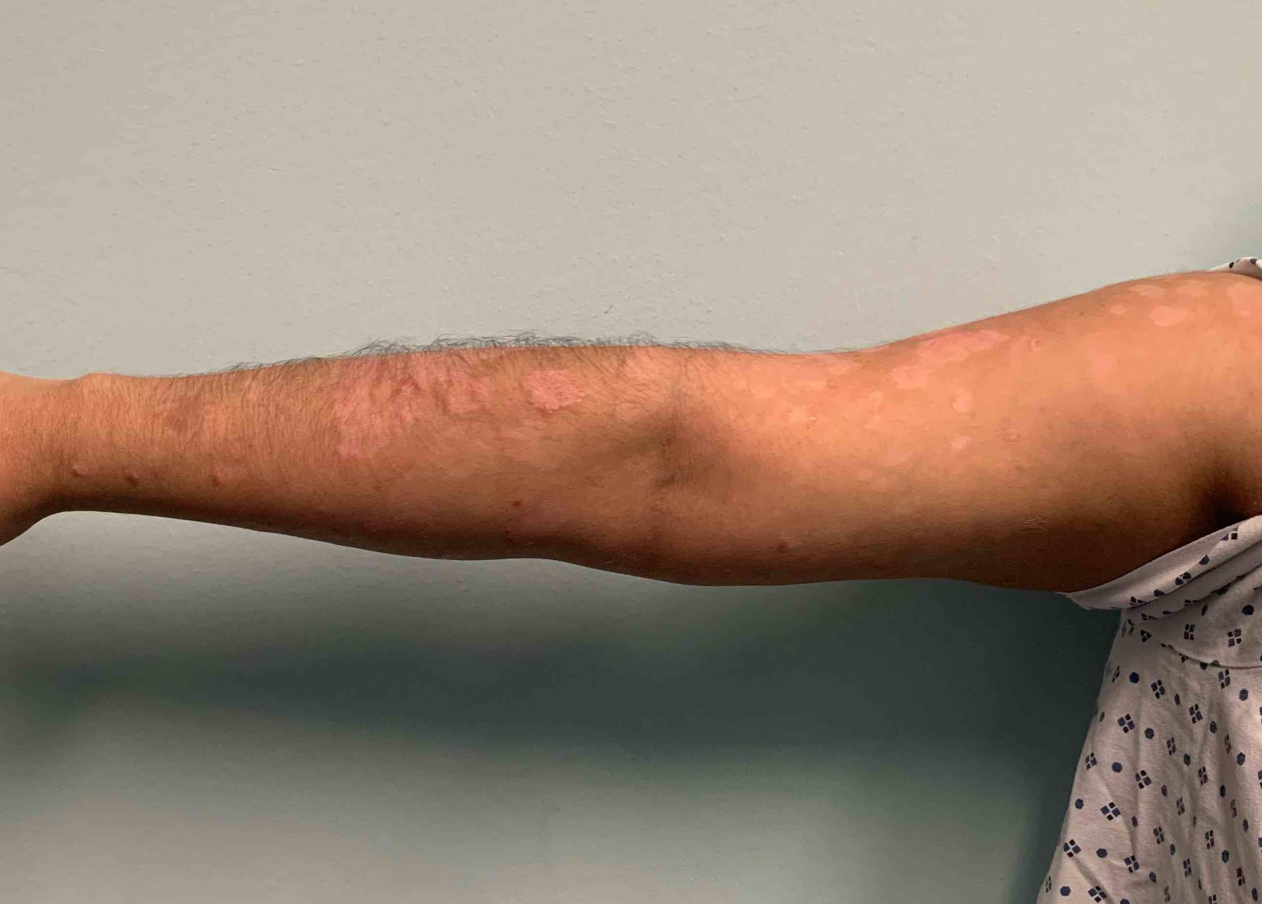 This is a 50 year old male patient who came in for psoriasis on his arms. The patient was treated with Humira and was very pleased with his successful results.