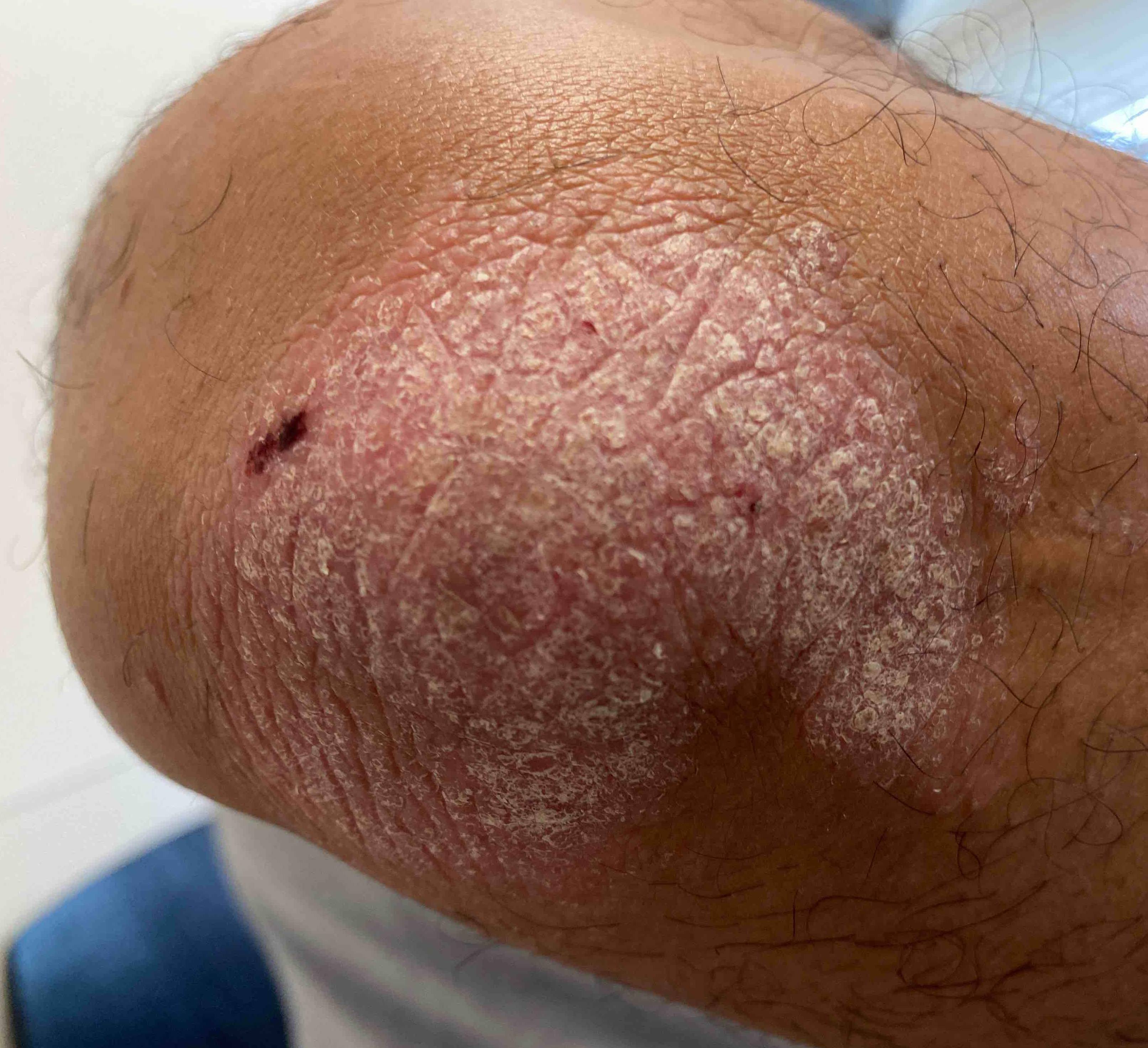 This is a male patient who came in for psoriasis to his elbow and was treated with Taltz by Dr. Turner. He was very content with his results and the service he received.